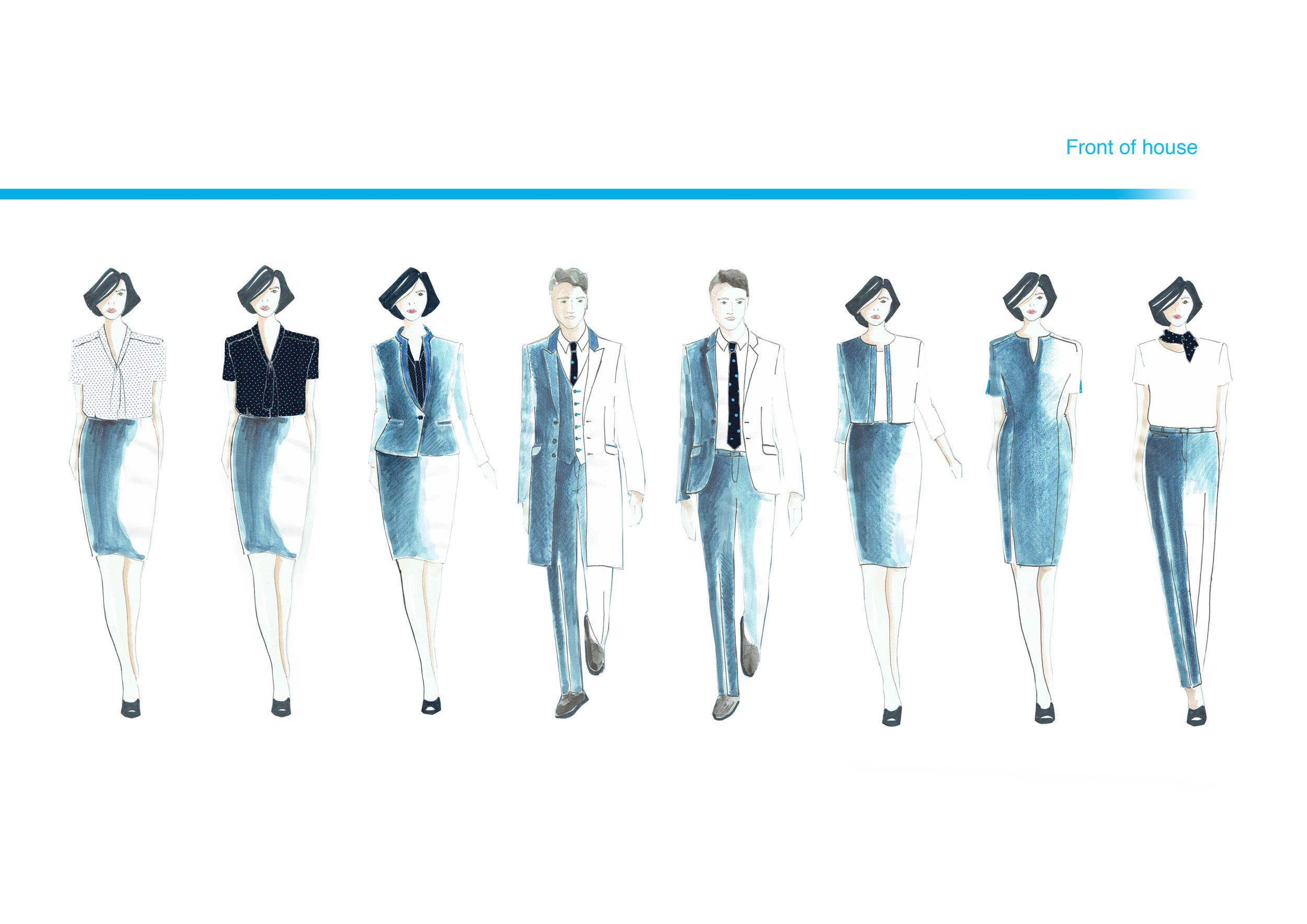 Trained by the luxury fashion houses, our Design Team sketch up their bespoke uniform ideas by creating elegant, couture illustrations. Each job position is annotated below the sketch, alongside fabric and trim boards indicating colour and texture.